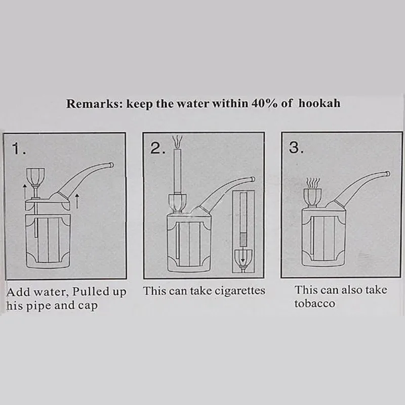 1. This product is made of environmentally friendly,non-toxic materials. 2. It can filter the harmful carcinogens such as tar/nicotine in cigarettes more effectively, and the phlegm/sore throat,it will reduce the scale on the teeth caused by smoking . 3. Use water pipe to filter to make the taste of the cigarette softer. 4. Wine or drink can be added to the bottle to give the cigarette a different taste. 5. How to use: Open the lid of the hookah and pour the water or drink into less than half. 6. This product is reasonable in structure, convenient and practical, with low smoking resistance and good filtering effect, it is your best choice.