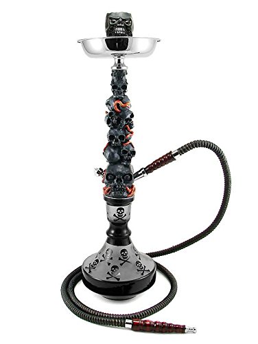 This is a Beautiful 24" Skull hookah. The vase is made out of glass with a Sandblast style and skull through out. What makes it one of kind is the wonderful look of the Skull shaft which is a 3D model with many skulls and red snakes. It is made out ceramic with Dark gray white and red colors. The whole hookah weight Approx 9 lbs. The body/shaft is a twist on, that makes the vase and the shaft be connected by just twisting it on and it will be secured preventing to fall easily like other hookahs that use rubber seal.The pipe (which goes inside the vase) is made out of stainless steel to prevent rust; it is screw on -easy to remove. The hose's diameter (inside) is big, which makes it easier and smoothly when you inhale. It measures approximately 70" long. The handle on the hose is made of wood, and to bring out the beauty the hose itself is made of PVC rubber and thread. The top ceramic bowl has the potential to handle high heat. Underneath the ceramic bowl there is a tray to prevent charcoal from falling. And it also comes with tongs to move the charcoal when is on, to prevent burning yourself. This hookah will make a great display on any part of the house, office, etc. Make your friend and Family member Envy you, on This one of a kind model that almost nobody has.Don't think because its a 1 hose hookah its made only for 1 person, the great thing about this hookah its that IT COULD ALSO BE CONVERTED INTO A 2 HOSE! By adding another hose and connector.
